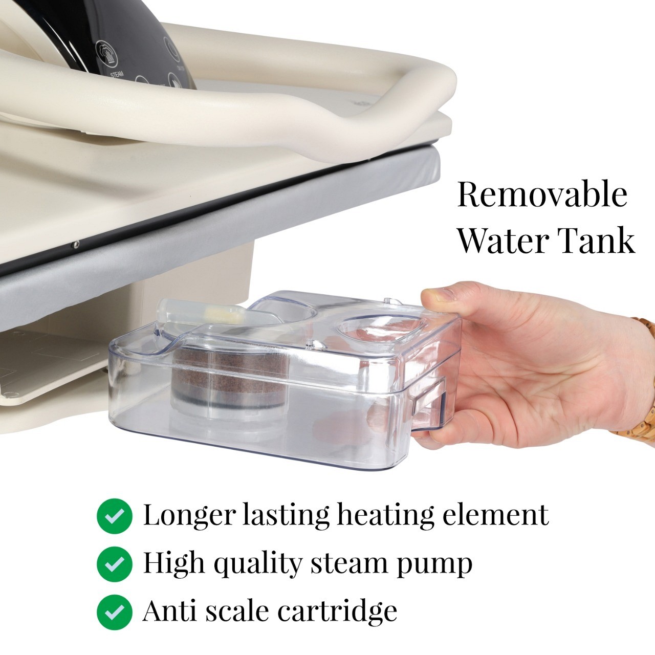 This press now includes a FREE iron attachment (see pictures), as well as a FREE Anti-Limescale Water Filter Cartridge, Replacement (Cloth) Cover & Replacement Foam Underlay / Underfelt (Iron Sponge Pad).