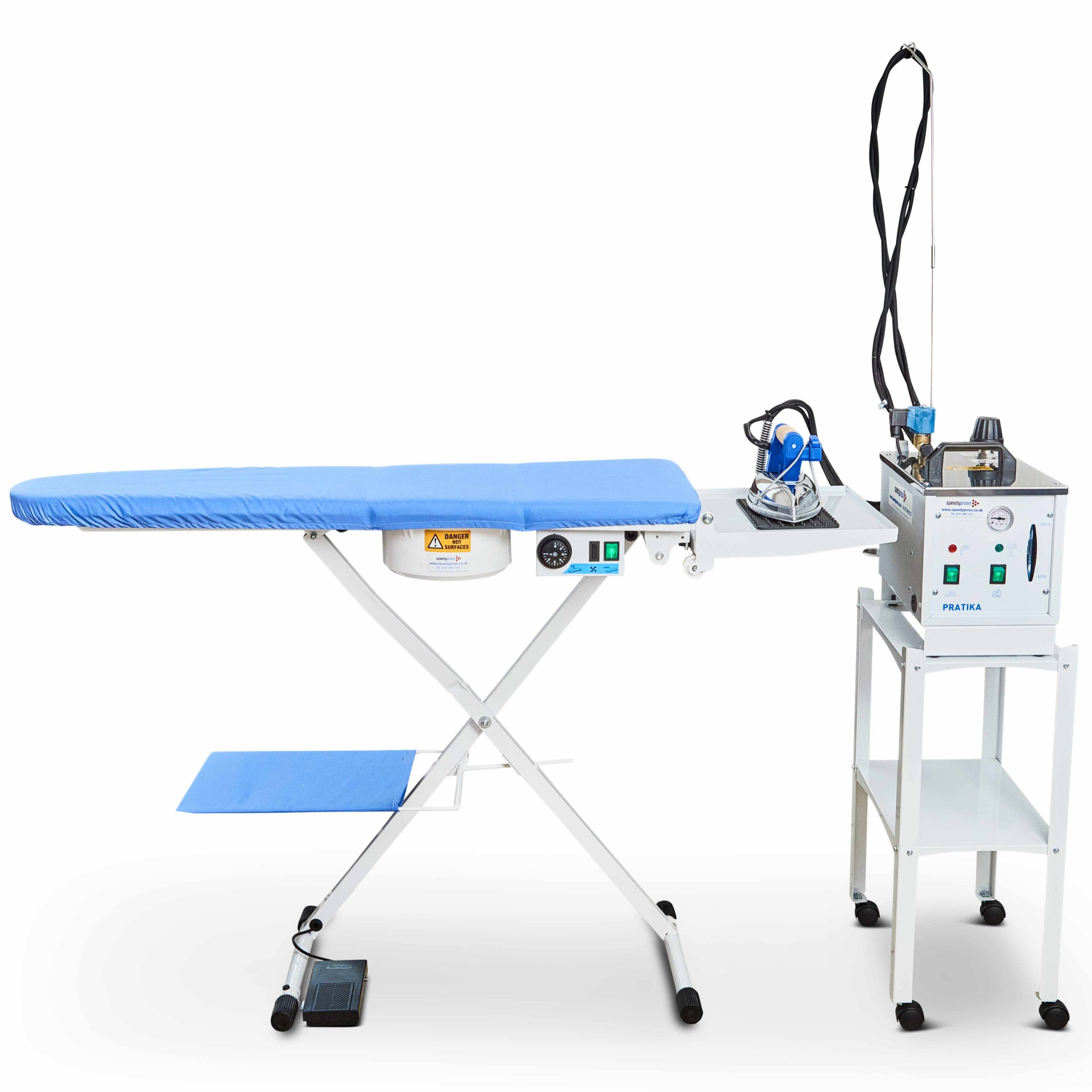 • Industrial Ironing Steam Iron & Boiler System with Vacuum & Thermostatically Heated Ironing Table.
