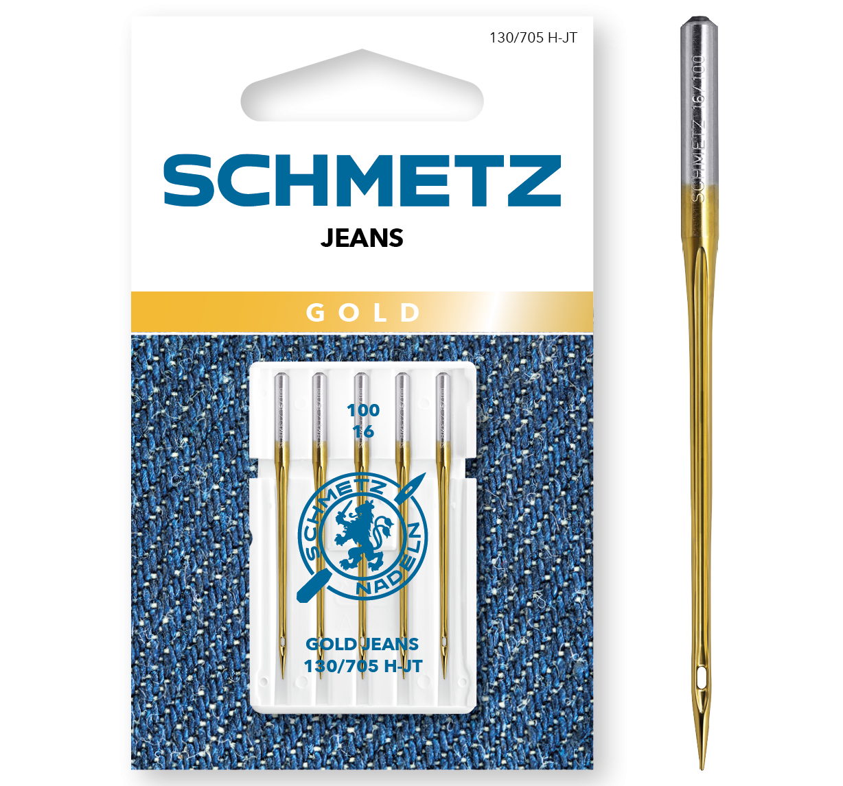 The Gold Line features a gold-coloured wear protection coating for longer needle durability. The Gold Line includes the Gold Embroidery needle and the new Gold Jeans needle (130/705 H-JT).