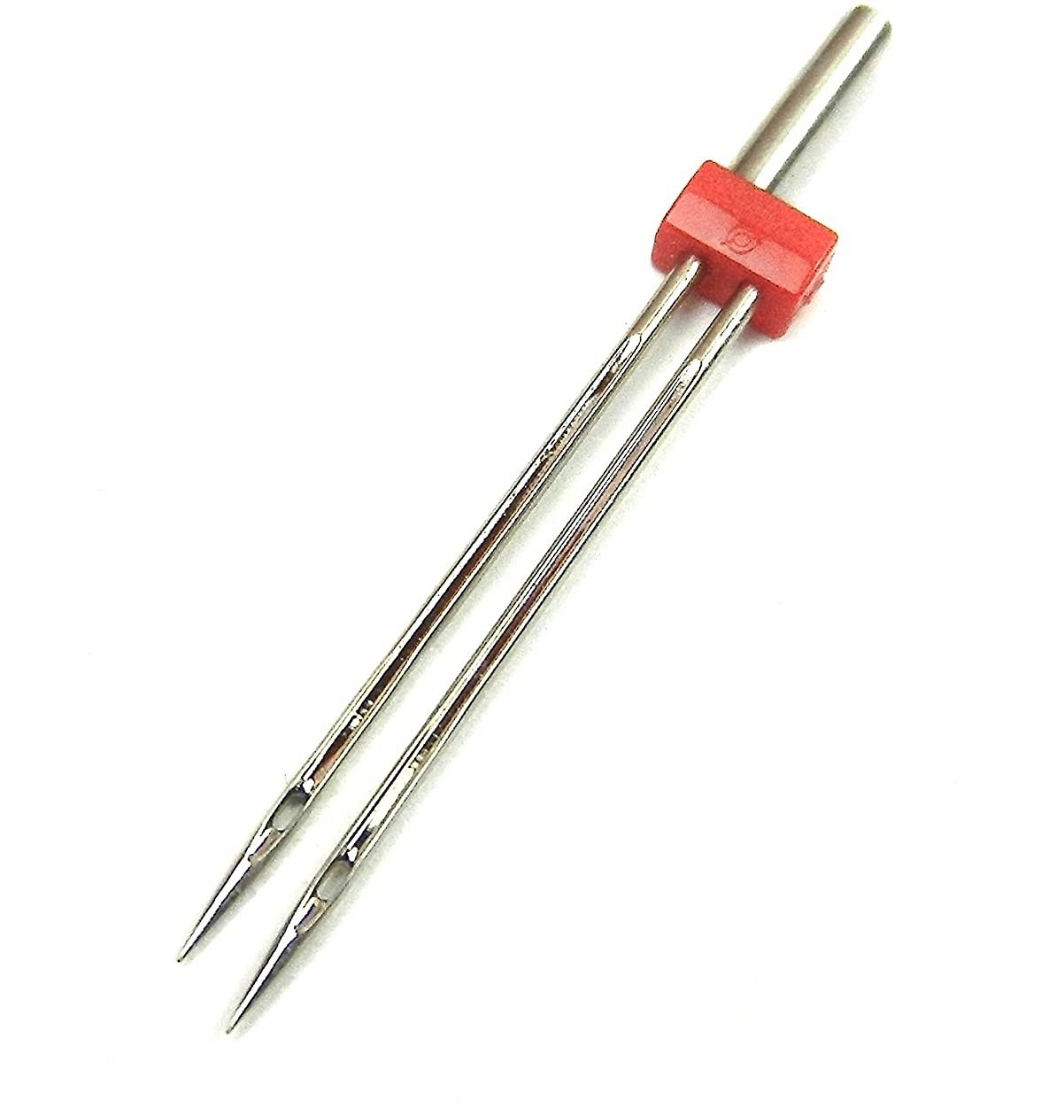 Twin needles are actually two needles mounted on one shaft and are used to create two rows of stitches at the same time. When using a double needle, two spools of thread will be used in the top of the machine. Pass the thread from each one on a different side of the tension discs and thread one into each needle. Only one bobbin thread will be used and the stitches will create a double "web" of stitches on the back of the work. Check to see how you like this under-stitching prior to using these needles. The package of needles will show two numbers. One is the needle size; the other is the distance between the two needles. Remember that the needles must fit through the hole in the stitch plate, so if you have been using a straight stitch plate you must change it to a zig-zag stitch plate to avoid hitting the plate with the needles! This could be a disappointing and expensive mistake!