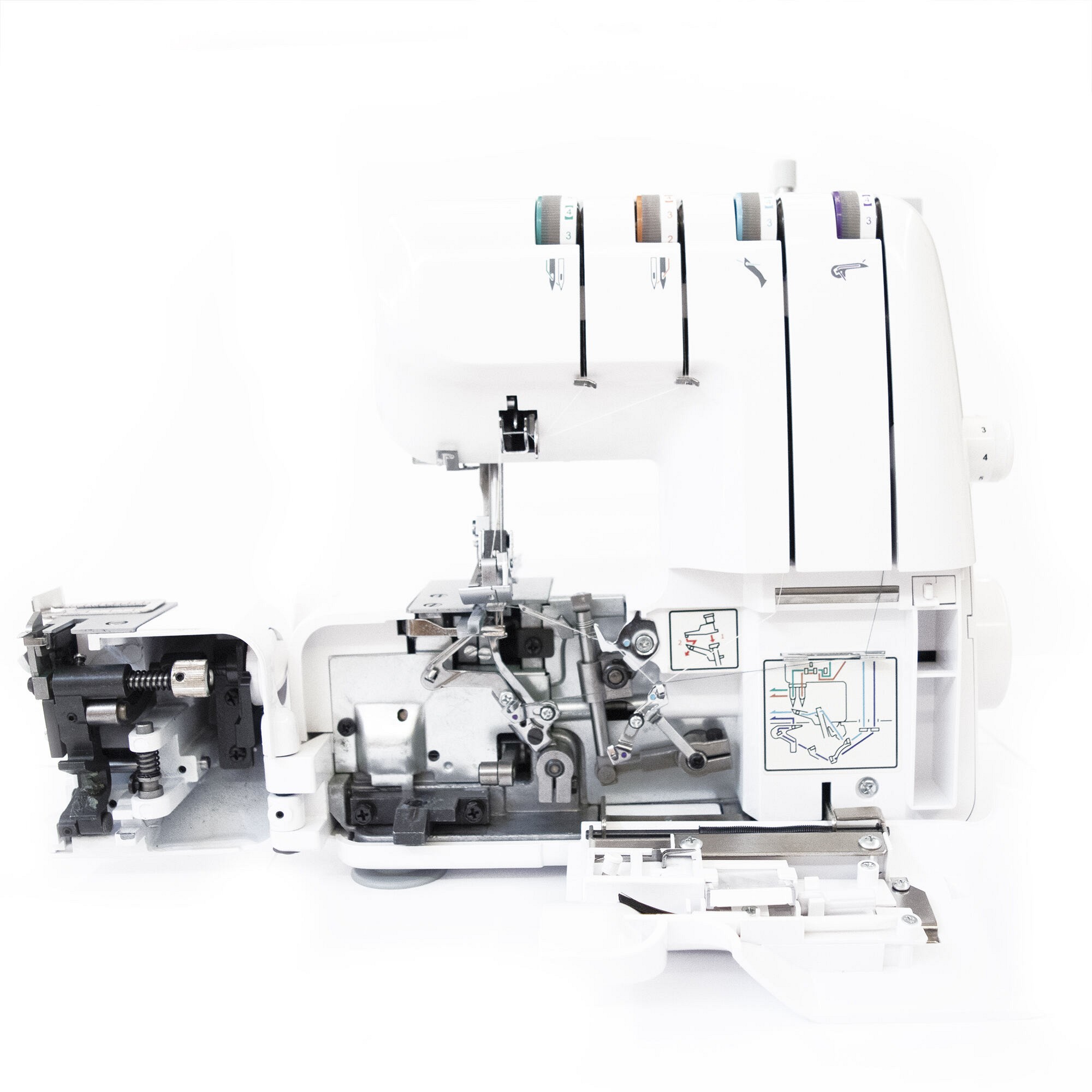 Versatile 3 or 4 Thread Overlocker, with Auto Tension Release, Differential Feed, Electronic Foot Control, Foot Pressure Regulator and a unique opening system for quick and easy threading with a colour-coded threading system!