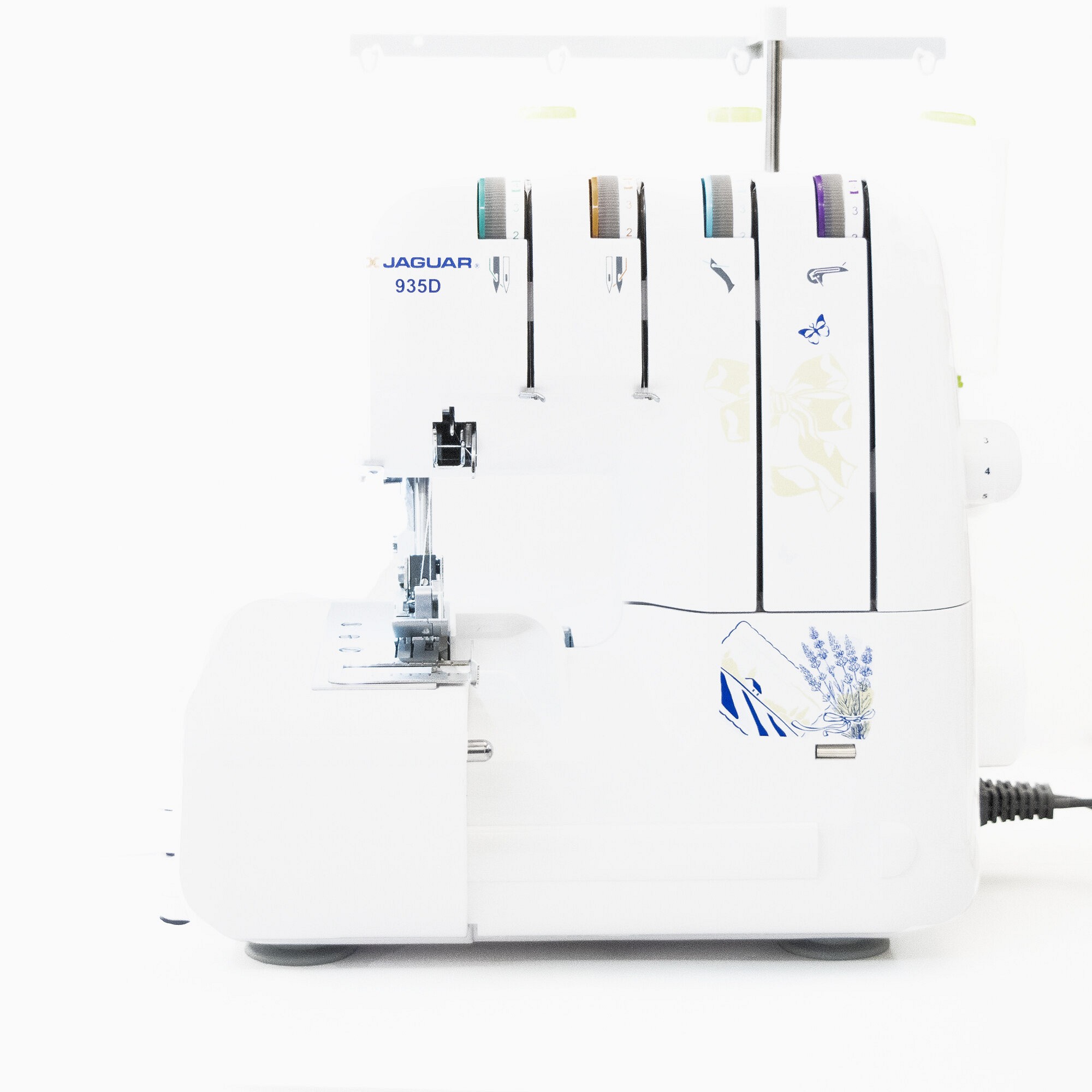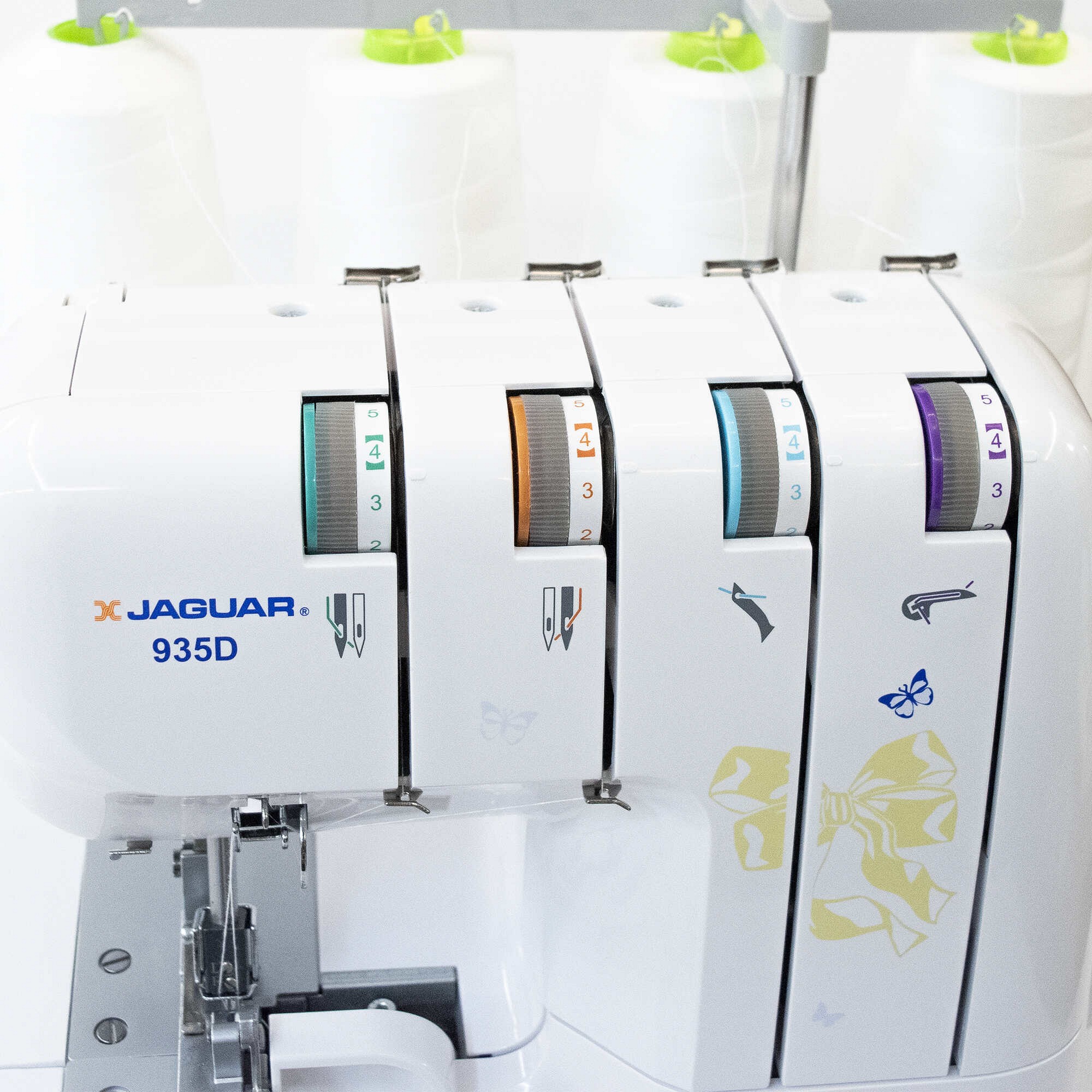 The Jaguar 935D will do 4 thread overlock and 4 thread safety seam overlock, 3 thread wide overlock, 3 narrow overlock and 3 thread rolled hem, 2 thread rolled hem, 2 thread overlock and 2 thread super stretch.