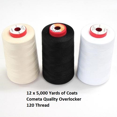 12 reels / cones of 5,000 yards of Coats Cometa quality overlocker 120 thread.