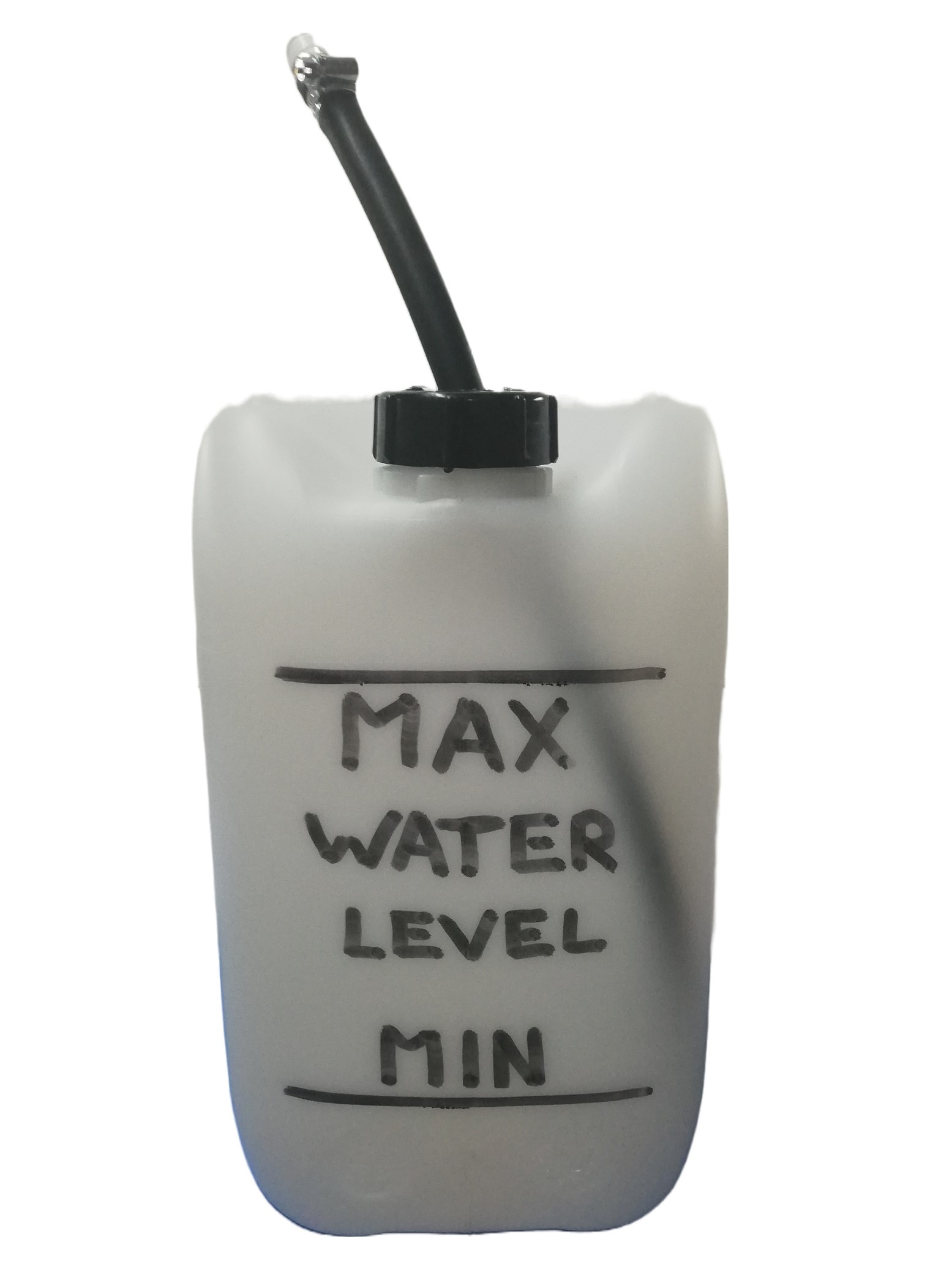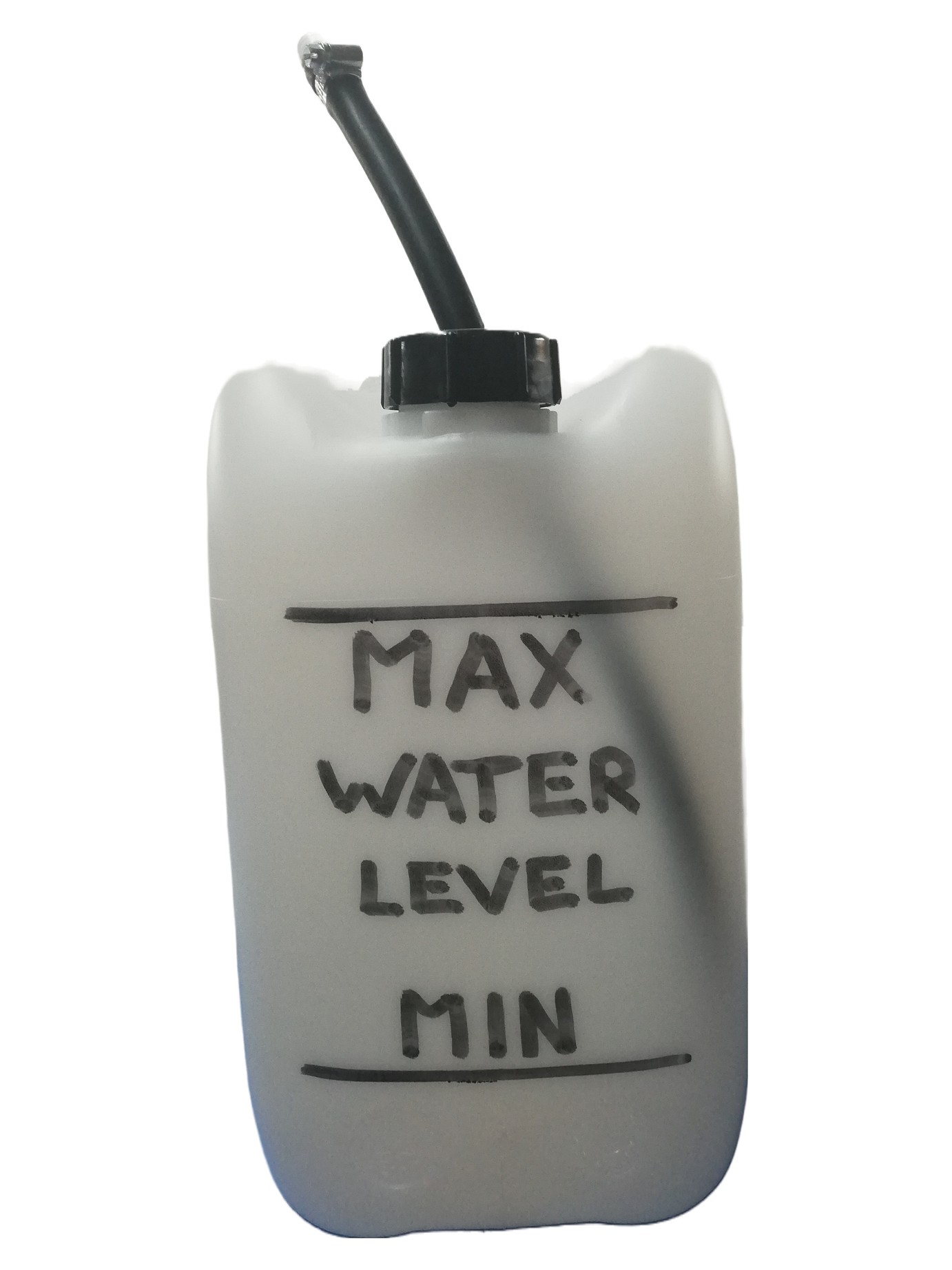 10-litre plastic jerrican with high and low level water indication marks.